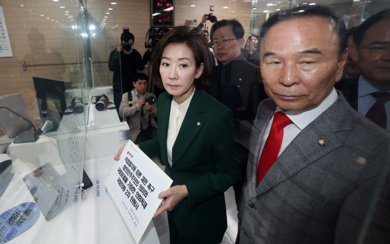 나경원 의원 등 이들은 이날 서울 여의도 국회 소통관에서 회견을 열어 "대통령 탄핵소추 핵심 사유였던 내란죄가 철회돼 안건의 동일성을 상실했다"며 "탄핵 심판을 각하해 줄 것을 청구한다"고 밝혔다.