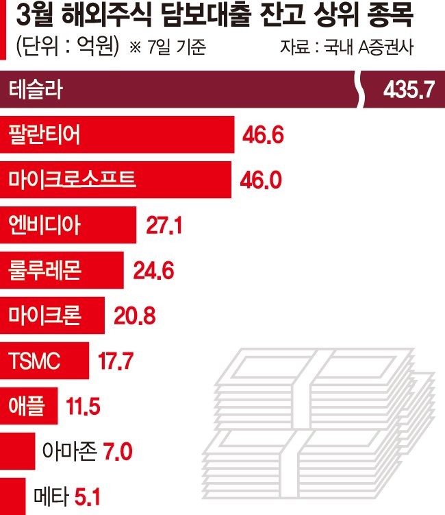 빚투 서학개미들이 가장 많이 담보로 잡은 해외주식은 테슬라이다. 올 3월 기준 개인들은 A증권사에서 테슬라 주식을 담보로 총 435억원을 대출받았다. 지난해 같은기간 255억원 대비 약 2배 수준이다. 테슬라는 이미 지난해 1월부터 이달까지 15개월 연속 A증권사 해외 주식담보대출 규모 1위를 유지하고 있다. 이달 해외주식 담보 대출잔고 상위 2~10위 종목 역시 모두 미국 주식이다. 사실상 빚투 수요가 미국 주식에 쏠린 양상이다.