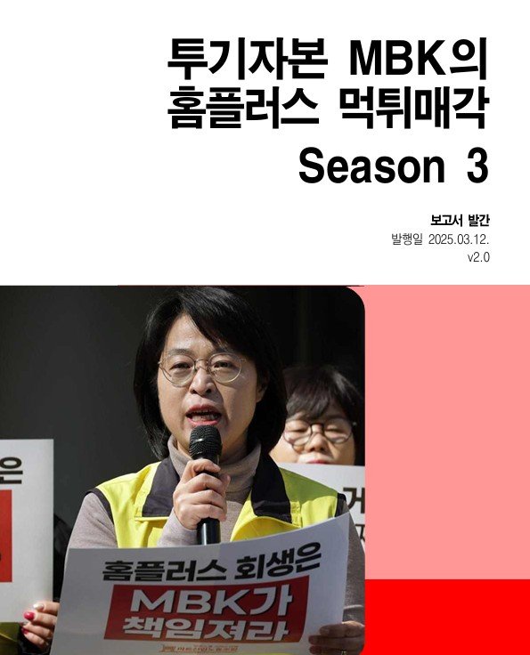 홈플러스 노동조합(노조)은 '투기자본 MBK의 홈플러스 먹튀매각 시즌3 보고서'를 내고 대주주인 사모펀드(PEF) 운용사 MBK파트너스를 강하게 비판했다.