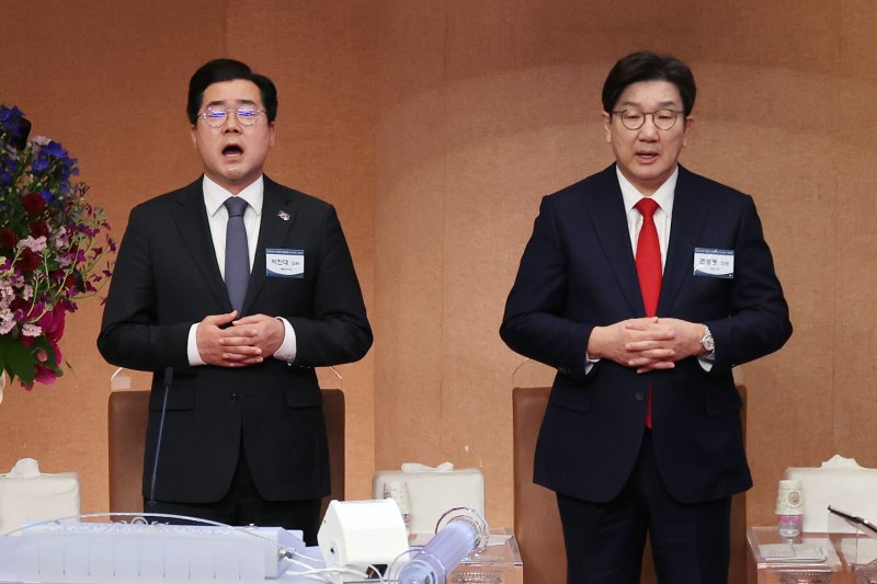 [서울=뉴시스] 조성우 기자 = 권성동(오른쪽) 국민의힘 원내대표와 박찬대 더불어민주당 원내대표가 16일 오후 서울 영등포구 여의도 순복음교회에서 열린 한국교회 부활절 연합예배 2차 준비 기도회에 참석해 예배하고 있다. 2025.03.16. xconfind@newsis.com [서울=뉴시스]조성우 김근수 기자 = 윤석열 대통령의 탄핵심판 선고일이 임박한 가운데 여야 원내대표들이 16일 여의도 순복음교회에서 열린 한국교회 부활절 연합예배 2차 준비 기도회에 참석했다.