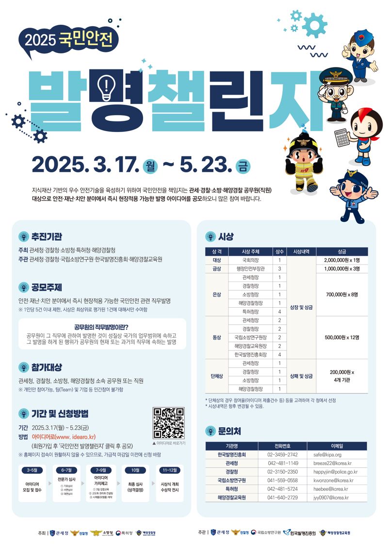 공모 내용은 즉시 현장에 적용 가능한 국민안전 관련 아이디어로, 관세청·경찰청·소방청·해양경찰청 소속 공무원 및 직원은 누구나 ‘아이디어로’ 홈페이지를 통해 1인당 최대 5건까지 응모가 가능하다.