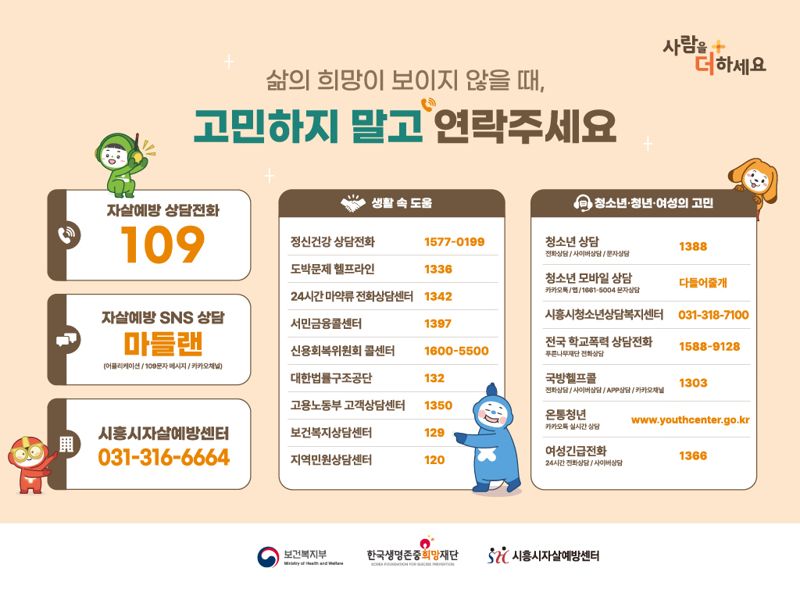 시흥시 관계자는 "삶이 어렵고 희망이 보이지 않아 도움이나 상담을 원할 경우, 시흥시자살예방센터로 연락하거나 누리집에서 상담 예약을 할 수 있다"고 말했다.