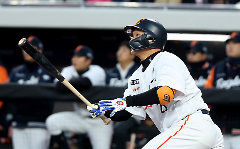 (서울=뉴스1) 이상철 기자 = 한화 이글스 외야수 김태연(28)이 대전 한화생명 볼파크 개장 1호 홈런을 터뜨렸다.