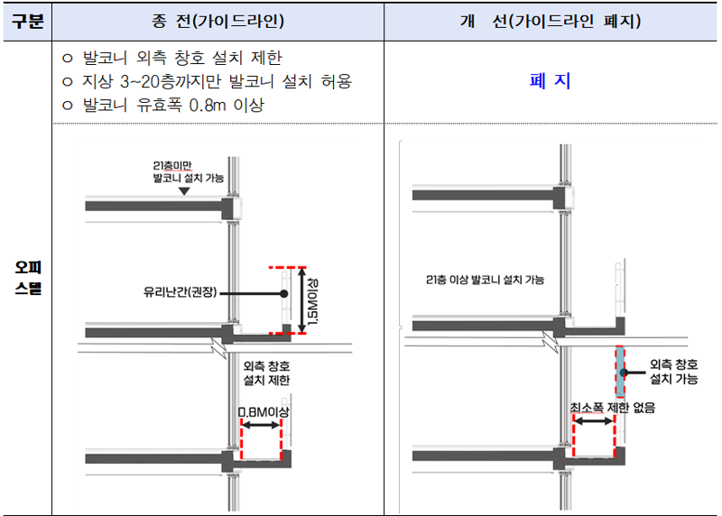 기준이 폐지되면서 오피스텔 발코니 외측에 창호 설치가 가능해졌다. 기존 오피스텔의 발코니 설치 허용 범위(지상 3~20층)도 완화됐으며 발코니 유효폭 0.8m 이상 등의 기준도 사라졌다.