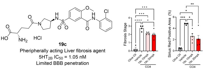 연구팀은 세로토닌 수용체 길항제로 작용하는 신약 후보물질 '19c'를 발굴했다. 이는 간별상세포에서 세로토닌 수용체의 작용을 차단해 섬유화 진행을 효과적으로 억제한다.
