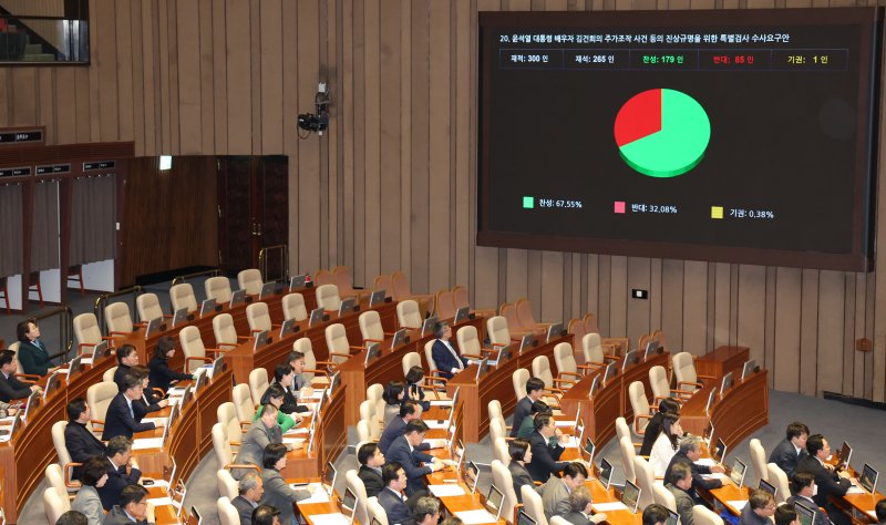 국회는 이날 본회의를 열고 '윤석열 대통령 배우자 김건희의 주가조작 사건 등의 진상규명을 위한 특별검사 수사요구안'(김건희 상설특검)을 재석 265명 중 찬성 179명, 반대 85명, 기권 1명으로 가결했다.