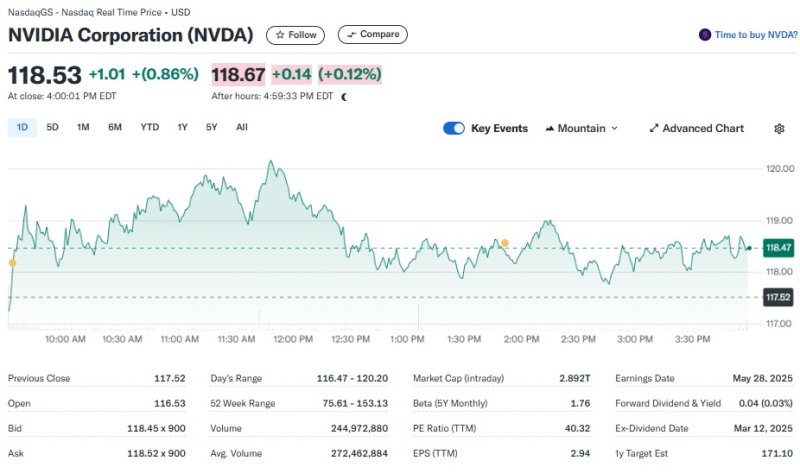 20일(현지시간) 뉴욕증시에서 엔비디아는 0.86% 상승한 118.53달러를 기록했다.