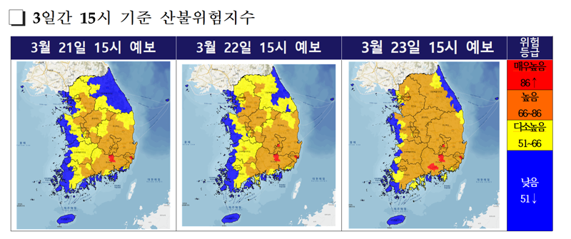 산불위험지수 분석결과에 따르면 강원 동해안과 남·서해안을 제외한 전국 대부분 지역의 산불위험지수가 '높음(66~85)'으로 예측됐으며, 이 상태는 한동안 지속될 것으로 전망된다.
