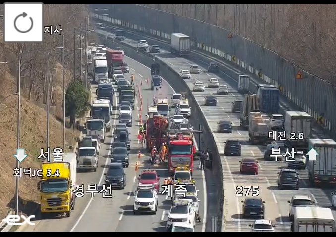 [대전=뉴시스]김도현 기자 = 21일 낮 12시 10분께 대전 대덕구 경부고속도로 서울 방향 회덕 분기점 인근에서 차량 8대를 싣고 가던 카캐리어가 옆으로 쓰러졌다.