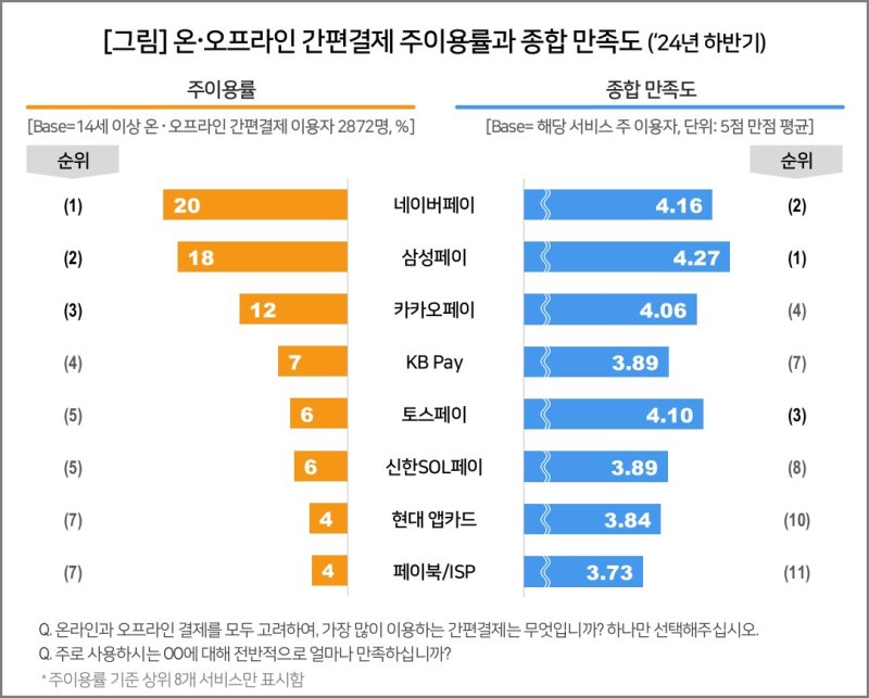 특히 오프라인 결제에 강점을 가진 삼성페이가 네이버페이와의 차이를 전년 7%p에서 2%p로 크게 좁혔다. 카카오페이와의 간격은 3%p에서 6%p로 확대됐다.