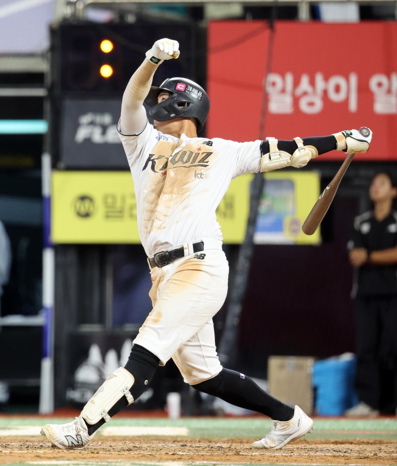 KT는 23일 수원 KT위즈파크에서 벌어진 2025 신한 쏠뱅크 KBO리그 한화와의 경기에서 배정대의 끝내기 안타에 힘입어 5-4로 승리했다.