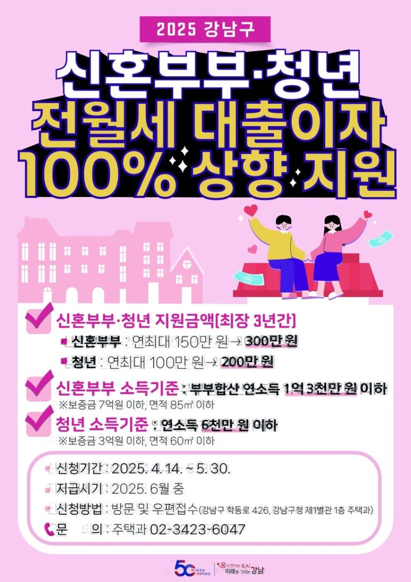 강남구, 신혼부부·청년 전월세 대출이자 지원액 2배로신혼부부 연간 최대 300만원, 청년 1인가구는 200만원