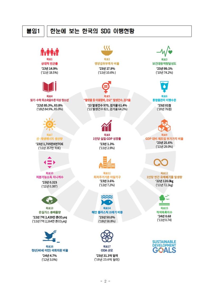 한국의 SDG 이행현황 보고서는 지난 2011년부터 최근까지 시계열과 경제협력개발기구(OECD) 주요국과의 비교를 통해 한국의 현 위치를 점검하는 목적으로 발간되고 있다.