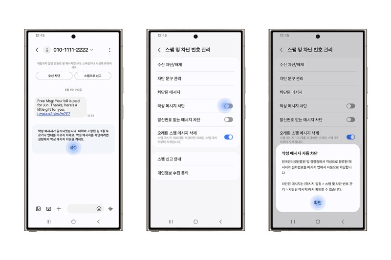 방통위와 KISA, 삼성전자는 지난해 9월부터 해당 기능 개발을 진행해왔다. 이용자는 자동으로 차단된 메시지 중 수신이 필요한 경우 ▲차단된 악성 메시지 ▲AI로 차단한 메시지 ▲내가 차단한 메시지에서 선택적으로 차단을 해제하거나 확인할 수 있다.