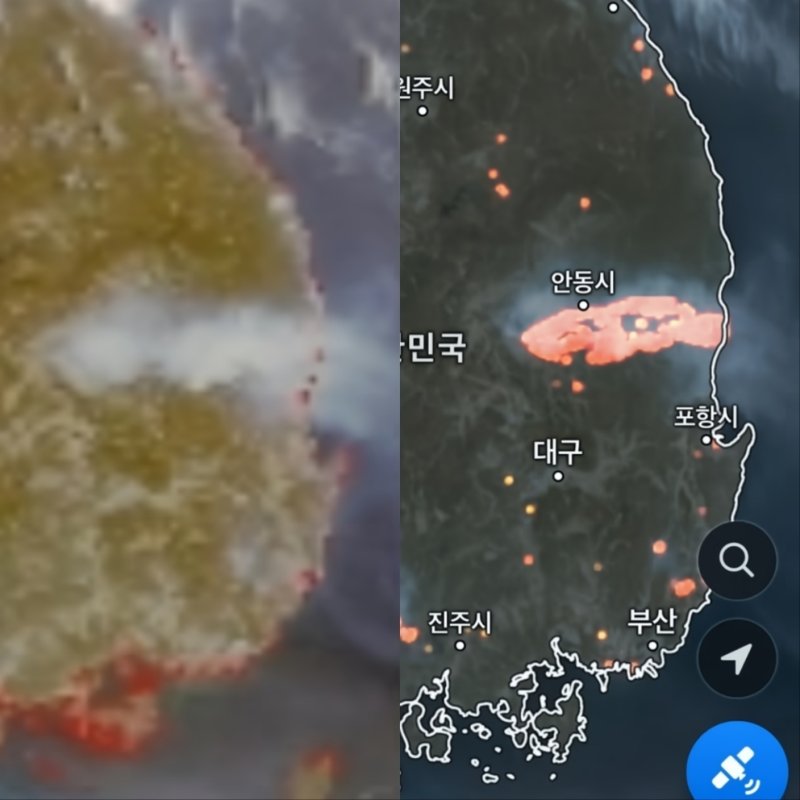 지난 22일 시작된 의성 산불의 연기는 25일 일본 열도에 도달했으며, 열 분포 사진으로는 경북 북부에서 동해안으로 광범위하게 확산했다.