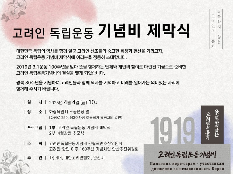고려인지원단체 '너머'는 다음 달 4일 경기 안산시 화랑유원지 내에서 고려인 독립운동 기념비 제막식을 연다고 26일 밝혔다.
