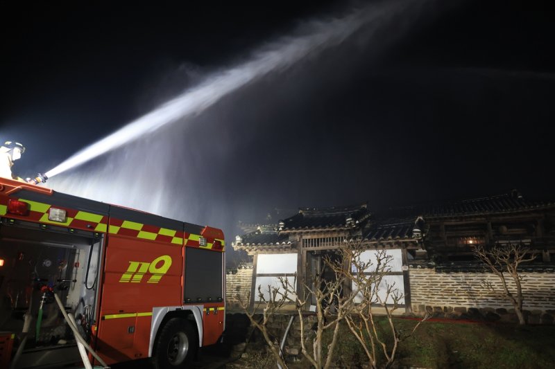 소방 당국은 장비를 이용해 병산서원 건물에 물을 뿌리는 작업을 이어가고 있다.