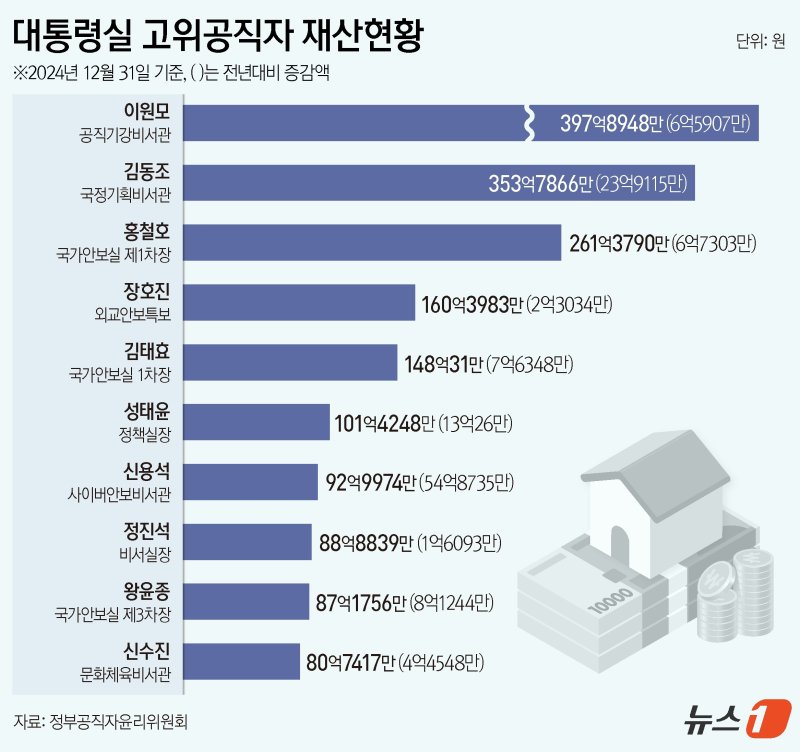 27일 정부공직자윤리위원회가 관보를 통해 공개한 '2025년 공직자 정기 재산변동사항 공개' 자료(지난해 12월31일 기준)에 따르면, 이 비서관은 대통령실 고위 공직자 54명 중 전체 재산 1위에 올랐다.
