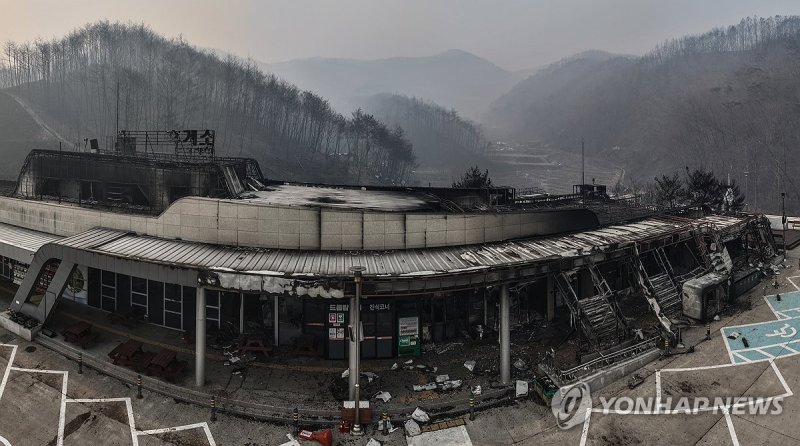 (청송=연합뉴스) 김선형 기자 = 경북을 휩쓴 '대형 산불'로 고속도로 휴게소까지 전소되는 피해가 발생했다.