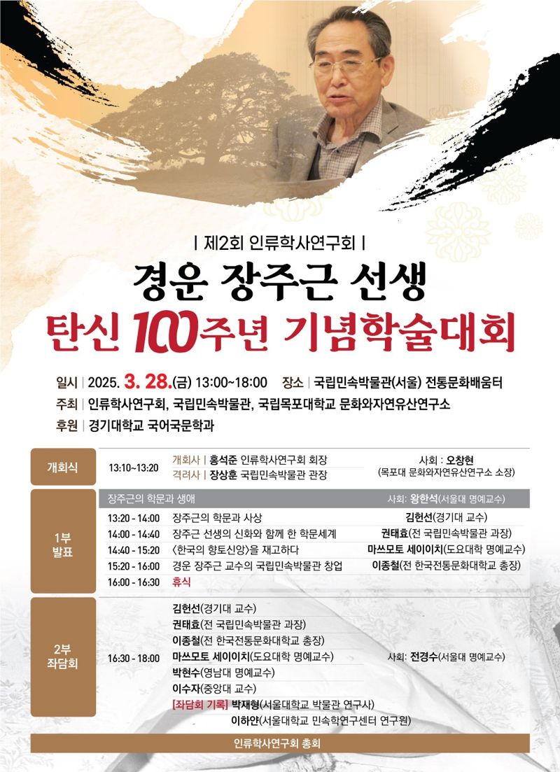 이번 학술대회는 장주근 선생 탄생 100주년을 맞아 인류학사연구회와 국립민속박물관, 국립목포대 문화와자연유산연구소가 공동 주최하는 행사로 그의 학문적 업적과 생애를 재조명해보기 위해 마련됐다.