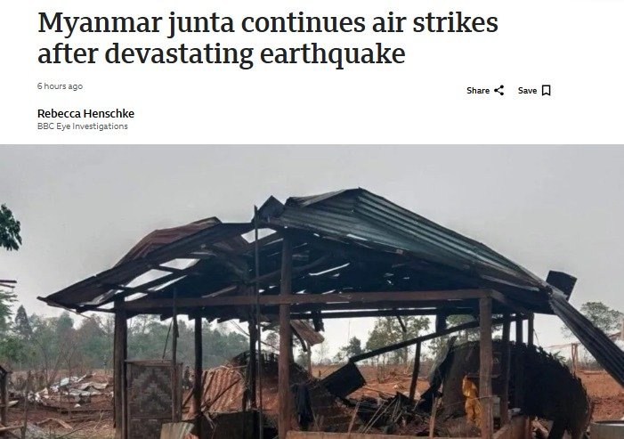 미얀마 군부는 지난 28일 지진이 발생한 이후 약 3시간 만에 민주화 반군의 기지인 북부 샨주 나웅초에 폭격을 감행했다. 이번 공습으로 모두 7명이 사망했다고 BBC는 전했다.