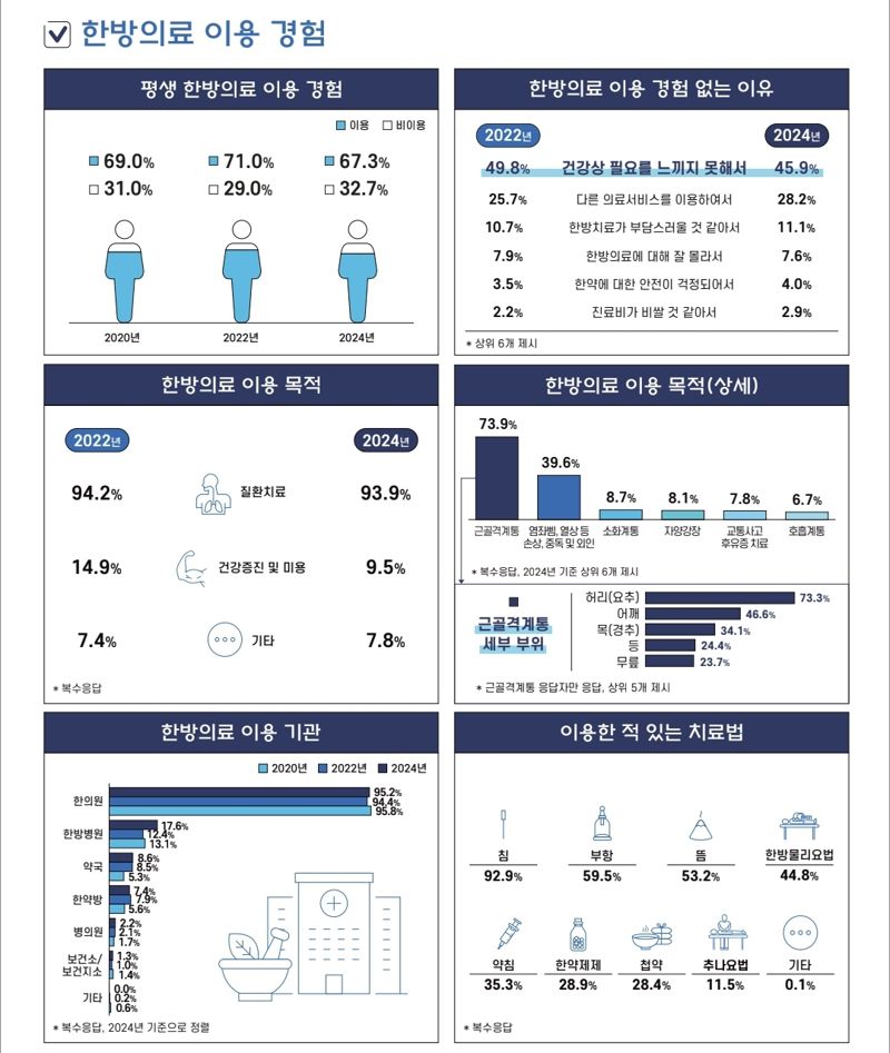 조사에 따르면, 19세 이상 국민 중 67.3%가 한방의료 이용 경험이 있는 것으로 나타났다. 한방의료를 선택한 주요 이유는 ‘치료 효과가 좋아서(42.5%)’였으며, 이용 목적은 ‘질환 치료(93.9%)’가 대부분을 차지했다. 한방의료 만족도는 79.5%로 지속 상승하는 추세다.
