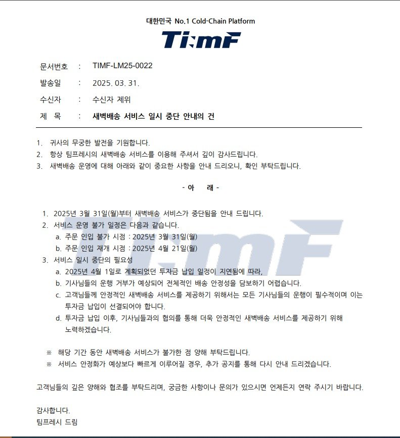 팀프레시는 고객사에 보낸 공문을 통해 "투자금 납입 일정이 지연되면서 기사님들의 운행 거부가 예상돼 전체적인 배송 안정성을 담보하기 어렵다"면서 배송 중단 사실을 알렸다.