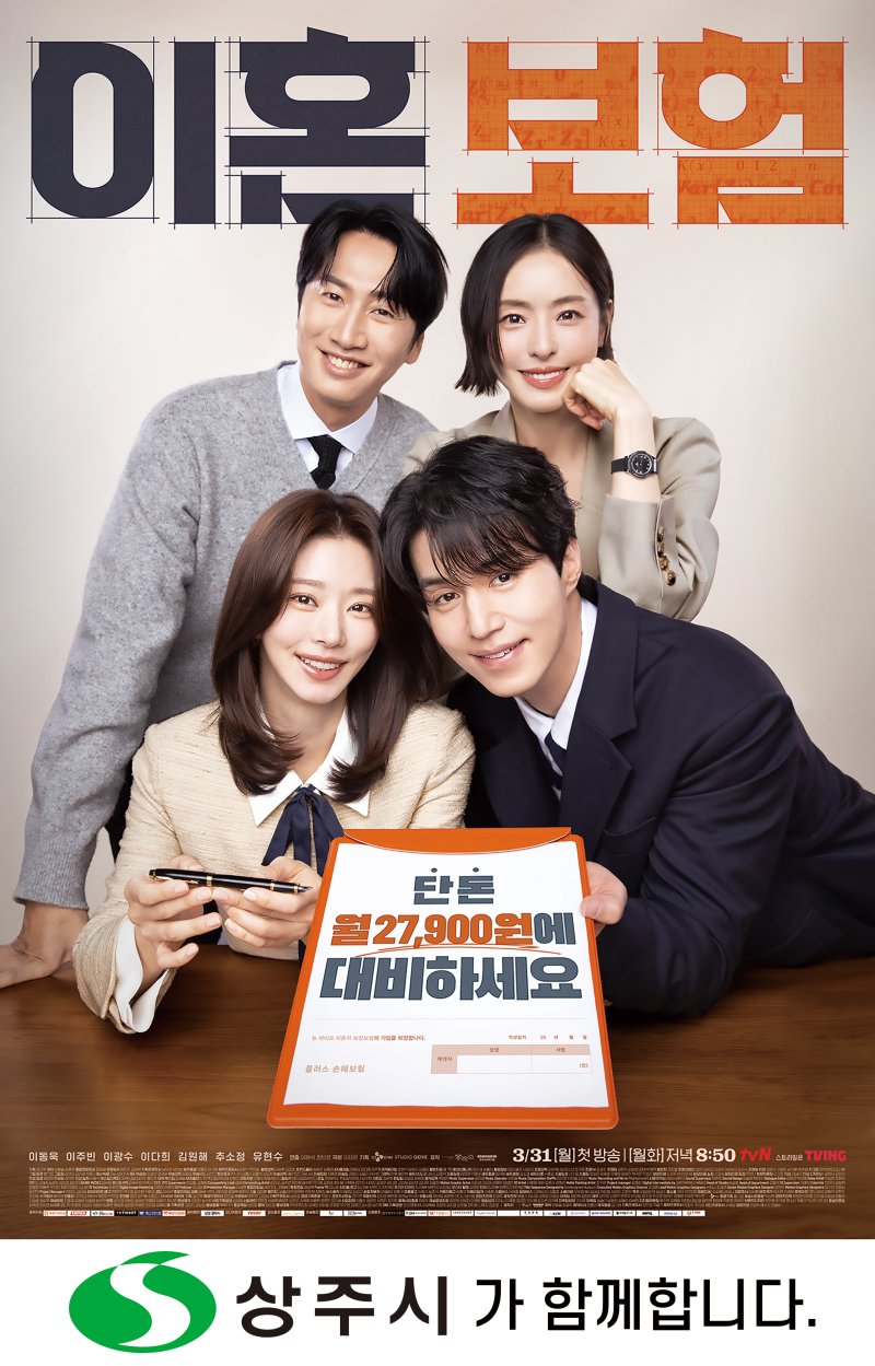 지난 3월 31일 첫 방송된 tvN '이혼보험'은 이동욱(노기준 역)과 이주빈(강한들 역)이 주연을 맡은 오피스 로맨스 코미디 드라마다.