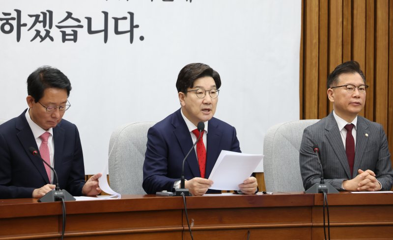 [서울=뉴시스] 이재우 한재혁 기자 = 권성동 국민의힘 원내대표는 1일 더불어민주당이 한덕수 대통령 권한대행 국무총리와 최상목 경제부총리 겸 기획재정부 장관 '쌍탄핵'을 예고한 것과 관련해 "내란 행위에 대해서는 우리 당의 모든 것을 걸고 싸울 준비가 돼 있다"고 밝혔다.