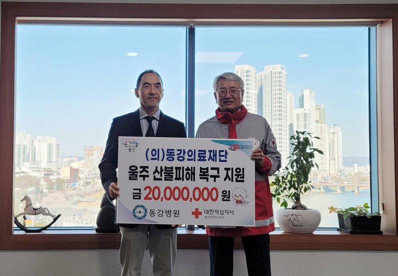 (울산=연합뉴스) 허광무 기자 = 동강의료재단 동강병원은 최근 울산 울주군 온양읍 일원에서 발생한 산불 피해 복구와 주민 지원을 위해 성금 2천만원을 대한적십자사 울산지사에 전달했다.
