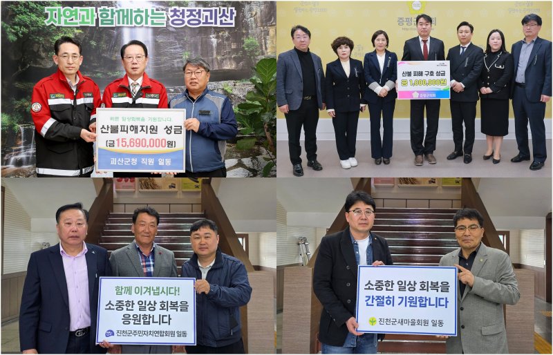 송인헌 군수는 "2023년 수해로 어려움을 겪을 때 전국에서 도움을 받아 극복할 수 있었다"라며 "이번 산불 피해 이재민들에게 작은 힘이 되길 바라며 하루빨리 일상이 회복되기를 기원드린다"고 했다.