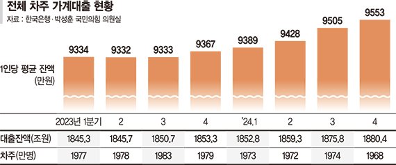 2일 국회 기획재정위원회 소속 박성훈 국민의힘 의원이 한국은행에서 제출받은 자료에 따르면 지난해 4·4분기 기준 가계대출 차주의 1인당 평균 대출잔액은 9553만원으로 집계됐다. 1년 전인 2023년 4·4분기(9367만원)보다 200만원 가까이 증가했다.