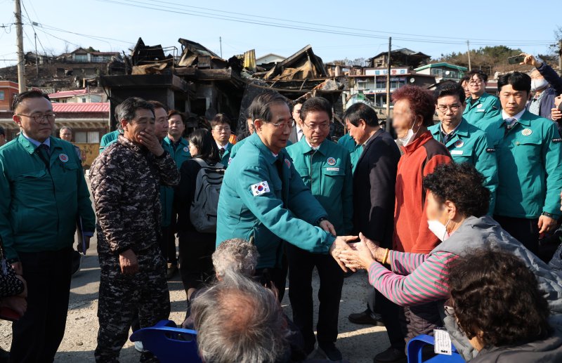 한덕수 대통령 권한대행 국무총리가 2일 경북 영덕 산불 피해 현장을 찾아 “정부가 끝까지 책임지고 복구하겠다”며 이재민들을 위로하고 신속한 복구와 지원을 약속했다. 한 권한대행은 이날 오후 경북 영덕군 노물리 마을을 찾아 현장을 점검하고 이재민들을 위로했다. 한 권한대행은 “마을 곳곳이 불길에 휩쓸려 삶의 터전이 무너진 모습을 보며, 주민분들이 얼마나 큰 충격과 상실감을 느끼셨을지 감히 헤아리기조차 어렵다"며 "정부와 지자체가 피해 수습과 복구를 최우선 과제로 삼고, 현장에서 필요한 지원이 신속하게 이뤄질 수 있도록 마지막까지 최선을 다해주기 바란다"고 말했다. 그는 "장기간 임시 대피 시설에 거주하고 있는 이재민들의 불편함이 최소화되도록 각별히 신경 써 주고, 장기적인 주거 문제 해결방안에 대해서도 신속히 검토해주시기 바란다"며 "전기와 통신이 두절된 마을에 대한 복구도 최대한 빠르게 마무리하고, 농가와 양식장 피해도 철저히 조사해서 주민들이 생계에 어려움이 없도록 지원책을 조속히 마련해달라"고 밝혔다. 자원봉사자들에게도 감사를 전했다.