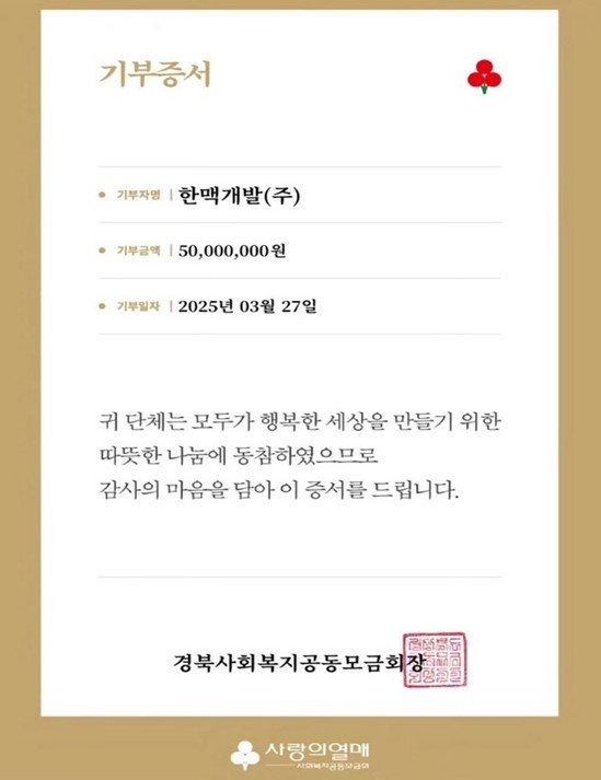 한맥CC는 작년에도 경북사회복지공동모금회 등에 3억8천여만원 상당의 생필품 등을 기부한 바 있다.