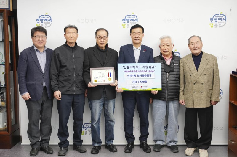 구에 따르면 지난 2일 성북구청장실에서 진행된 전달식에는 정릉4동 한마음공동체 회원 5명이 참석했다. 모금된 성금은 산불 피해 주민들의 복구 지원과 재난 구호 활동을 위해 전달될 예정이다.