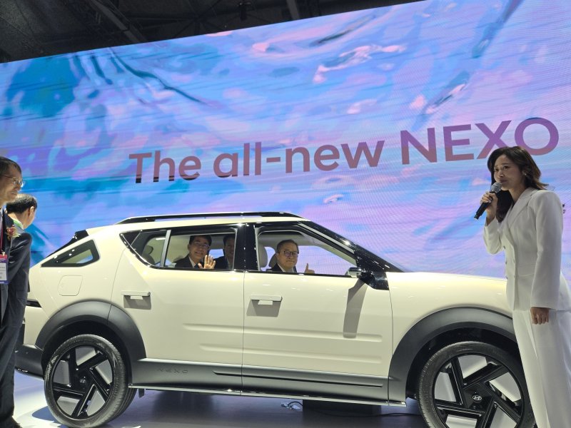 현대차 부스에선 수소전기차(FCEV) '넥쏘'의 2세대 모델 '디 올 뉴 넥쏘'에 이승렬 실장이 김동욱 부사장과 함께 탑승했다. 디 올 뉴 넥쏘는 7년 만에 나오는 넥쏘 완전 변경 모델로 이번 전시회를 통해 세계 최초로 공개됐다.