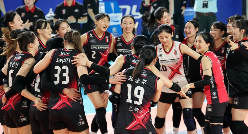 "'한 세트만 따자'고 서로 격려했다"는 정관장은 불굴의 의지로 남은 3세트를 내리 승리하면서 결국 이날 경기 대역전승을 작성했다.
