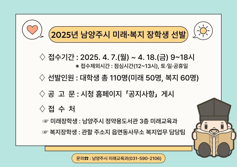 이번 장학생 선발은 4월 4일 공고일 기준으로 시에 1년 이상 주민등록을 두고 거주 중인 대학생을 대상으로 진행된다. 신청 기간은 4월 7일부터 18일까지다. 선발 분야는 △미래장학생 △복지장학생 두 가지로 구분된다.