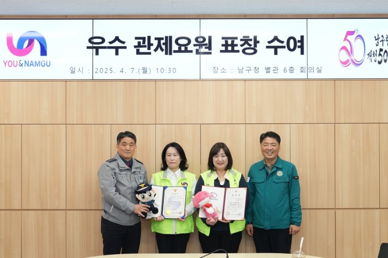 [부산=뉴시스]김민지 기자 = 부산 남구와 남부경찰서는 7일 음주 운전자 검거에 기여한 남구 CCTV통합관제센터 우수 관제요원 2명에게 남구청장 표창과 남부경찰서장 표창을 각각 수여했다고 밝혔다.