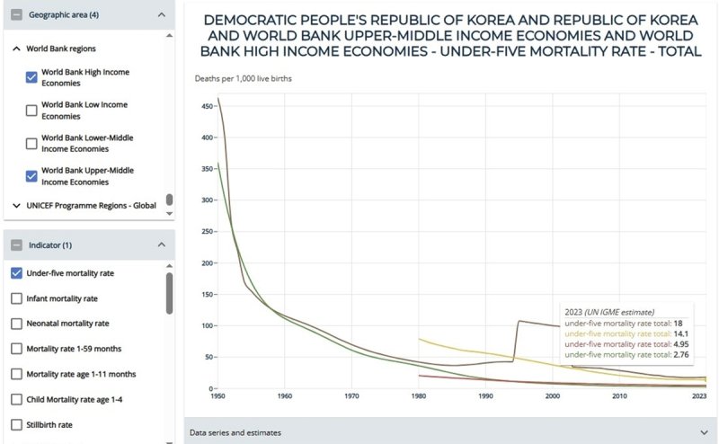 8일 유엔아동사망률측정통합기구가 최근 공개한 영유아 사망률 통계에 따르면 2023년 기준 북한의 5세미만 영유아 사망률은 1천명당 18명으로 추정됐다.