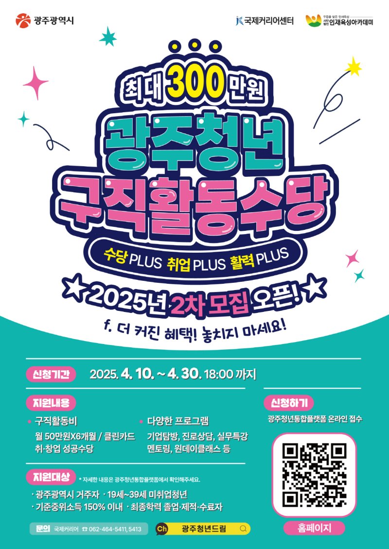 선정 결과는 5월 중 광주 청년 통합플랫폼 마이페이지 또는 문자 메시지로 개별 통보한다. 최종 대상자는 온라인 예비교육 이수와 청년 구직활동 수당 지급을 위한 클린카드 발급 절차 등을 이행하면 된다.