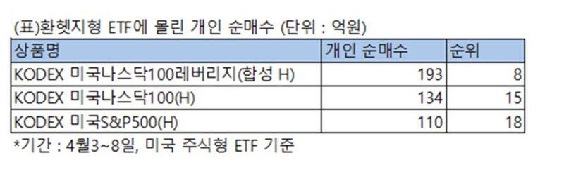 지난 8일까지 4일 동안 S&P500지수가 12.1%, 나스닥100지수가 13.3% 급락하자 국내 ETF 개인투자자들은 같은 기간 1조3765억원이 넘는 순매수를 기록하는 등 적극적인 매수세를 나타냈다. 미국 주식형 ETF 상품 가운데 개인 순매수 기준 KODEX 미국나스닥100레버리지(H)가 8위, KODEX 미국나스닥100(H) 15위, KODEX 미국S&P500(H) 18위에 오르는 등 환헷지형 미국투자 상품에 대한 선호도가 눈에 띄게 높아졌다. 지난 달 말까지만 하더라도 환헷지형 상품들은 개인 순매수 30위 밖에 있었다.