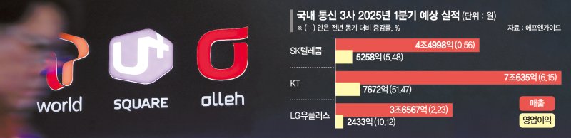 9일 금융정보업체 에프엔가이드에 따르면 국내 통신 3사의 올해 1·4분기 총 매출액은 15조2200억원, 총 영업이익은 1조5363억원으로 예상된다. 이는 지난해 같은 기간 대비 매출은 3.5%, 영업이익은 25.3% 각각 증가하는 수치다.