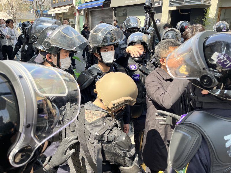 현행범 체포된 이 씨는 군복 차림에 헬멧을 착용하고 있었던 것으로 전해진다. 그가 유리창을 부수는 데 사용한 곤봉은 경찰이 압수했다.