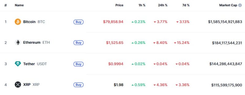 11일 오전 6시 30분 현재 글로벌 코인 시황 중계사이트인 코인마켓캡에서 비트코인은 24시간 전보다 3.77% 하락한 7만9858달러를 기록하고 있다.
