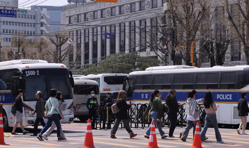 (서울=뉴스1) 이비슬 기자 = 서울 종로구는 윤석열 전 대통령 탄핵심판 전후 헌법재판소 인근 도로를 차단하고 있던 경찰 버스 일부를 철수 조치했다고 11일 밝혔다.