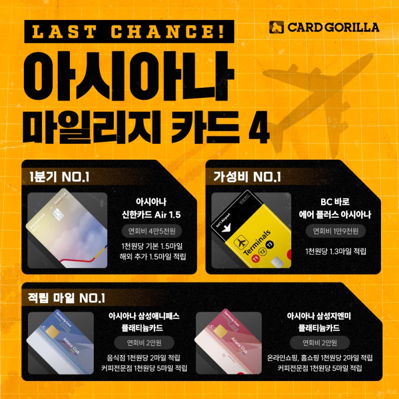 [서울=뉴시스]권안나 기자 = 신용카드 플랫폼 카드고릴라가 대한항공과의 합병으로 단종을 앞두고 있는 '아시아나 마일리지 카드' 가운데 알짜 혜택을 담은 상품 4종을 소개했다.