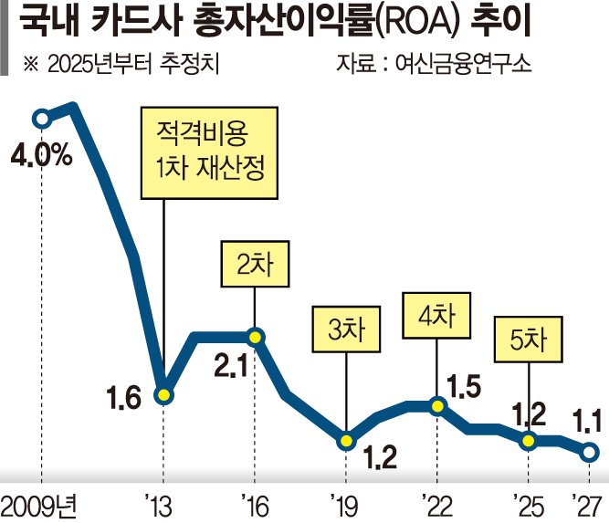 13일 여신업계에 따르면 금융당국의 규제가 강화되면서 국내 카드사의 총자산이익률(ROA)은 오는 2027년 1.1%까지 추락할 전망이다.