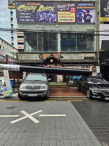 13일 오전 10시 50분께 수원시 팔달구의 유흥가인 인계박스 내 도로에 서 있던 입간판이 쓰러지면서 주차된 차량을 덮쳤다.