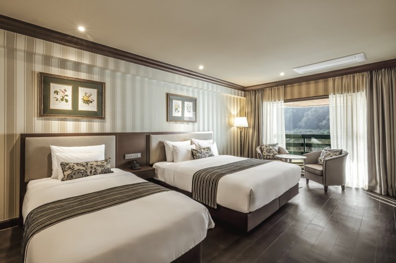 이그제큐티브 패밀리 트윈 객실은 헌터그린 컬러를 메인으로 차분하고 따뜻한 분위기를 자아낸다. 이그제큐티브 트윈 객실은 플라워 패턴 벽지와 버건디 컬러를 활용해 아늑한 분위기를 조성했다.